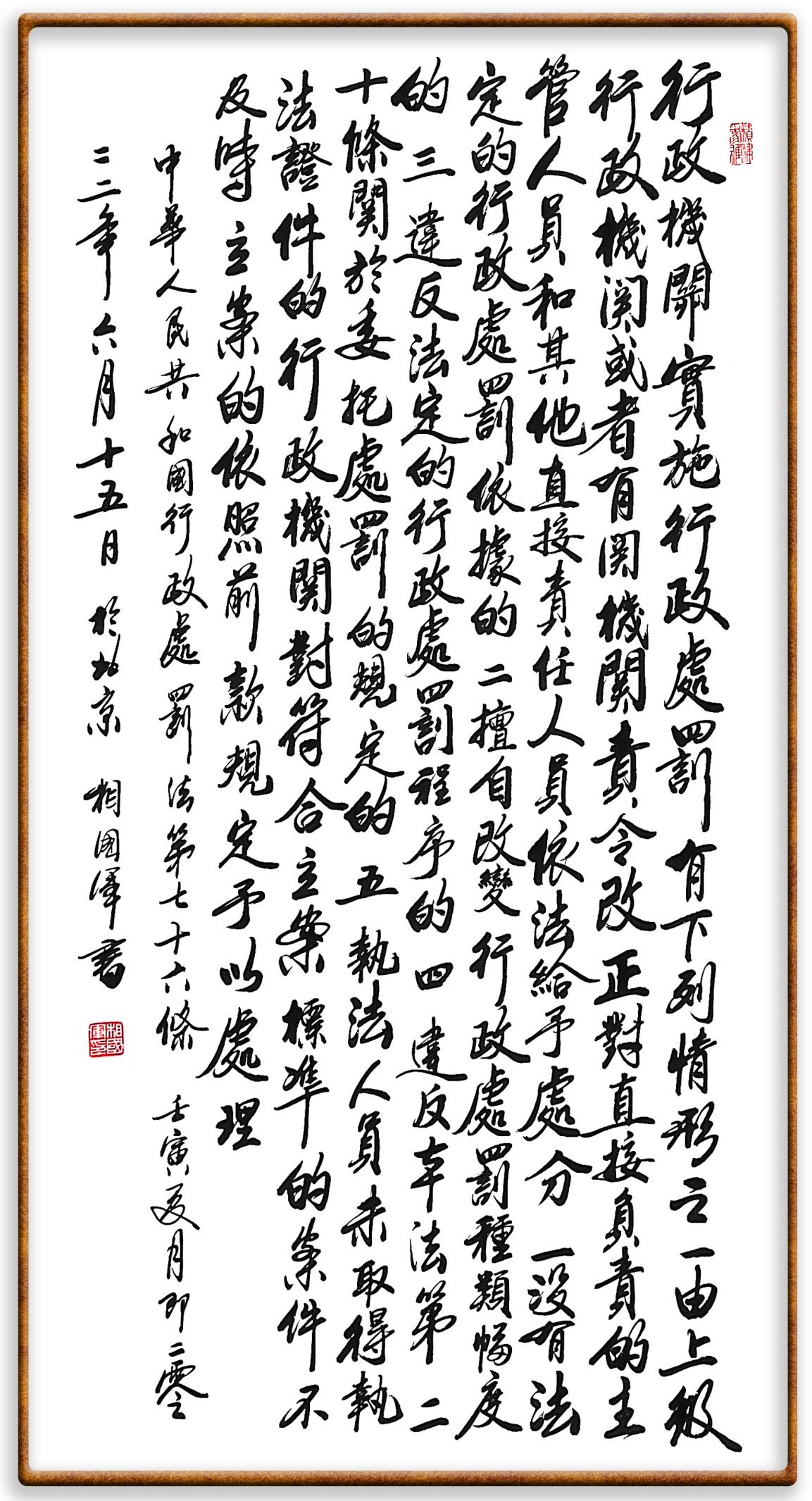 繼《中華人民共和國民法典》《中華人民共和國土地管理法》《中華人民共和國土地管理法實施條例》《中華人民共和國法律援助法》之后,法治日報社聯(lián)合北京市司法局、北京書法家協(xié)會,將筆端對準《中華人民共和國憲法》和《中華人民共和國行政處罰法》。