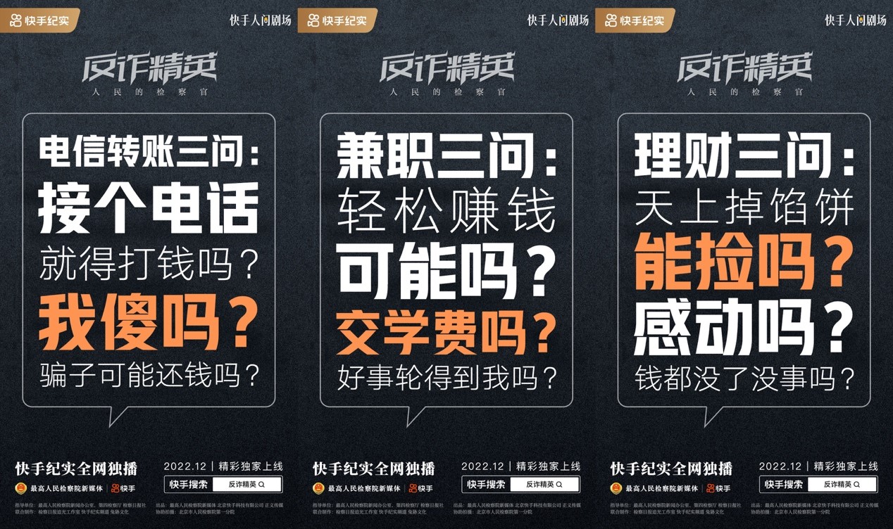 單親媽媽為何深陷“殺豬盤”執(zhí)迷不悟?什么樣的項(xiàng)目專騙老年人還屢屢得手?詐騙分子如何一人分飾多角?現(xiàn)實(shí)中,電信網(wǎng)絡(luò)詐騙犯罪愈演愈烈,亟需人們提高警惕。近日,反電信網(wǎng)絡(luò)詐騙法正式施行。由最高人民檢察院新聞辦公室、第四檢察廳及檢察日報(bào)社指導(dǎo),最高人民檢察院新媒體、快手及正義傳媒聯(lián)合出品的反詐主題紀(jì)實(shí)短劇《反詐精英——人民的檢察官》(以下簡稱“《反詐精英》”)于2022年12月10日在快手獨(dú)家上線,@最高人民檢察院 @正義網(wǎng) 兩大快手賬號首發(fā)?!斗丛p精英》從奮戰(zhàn)在辦案一線的人民檢察官視角出發(fā),以富有戲劇張力的紀(jì)實(shí)短劇形式講述真實(shí)反詐故事,創(chuàng)新呈現(xiàn)專業(yè)普法內(nèi)容。